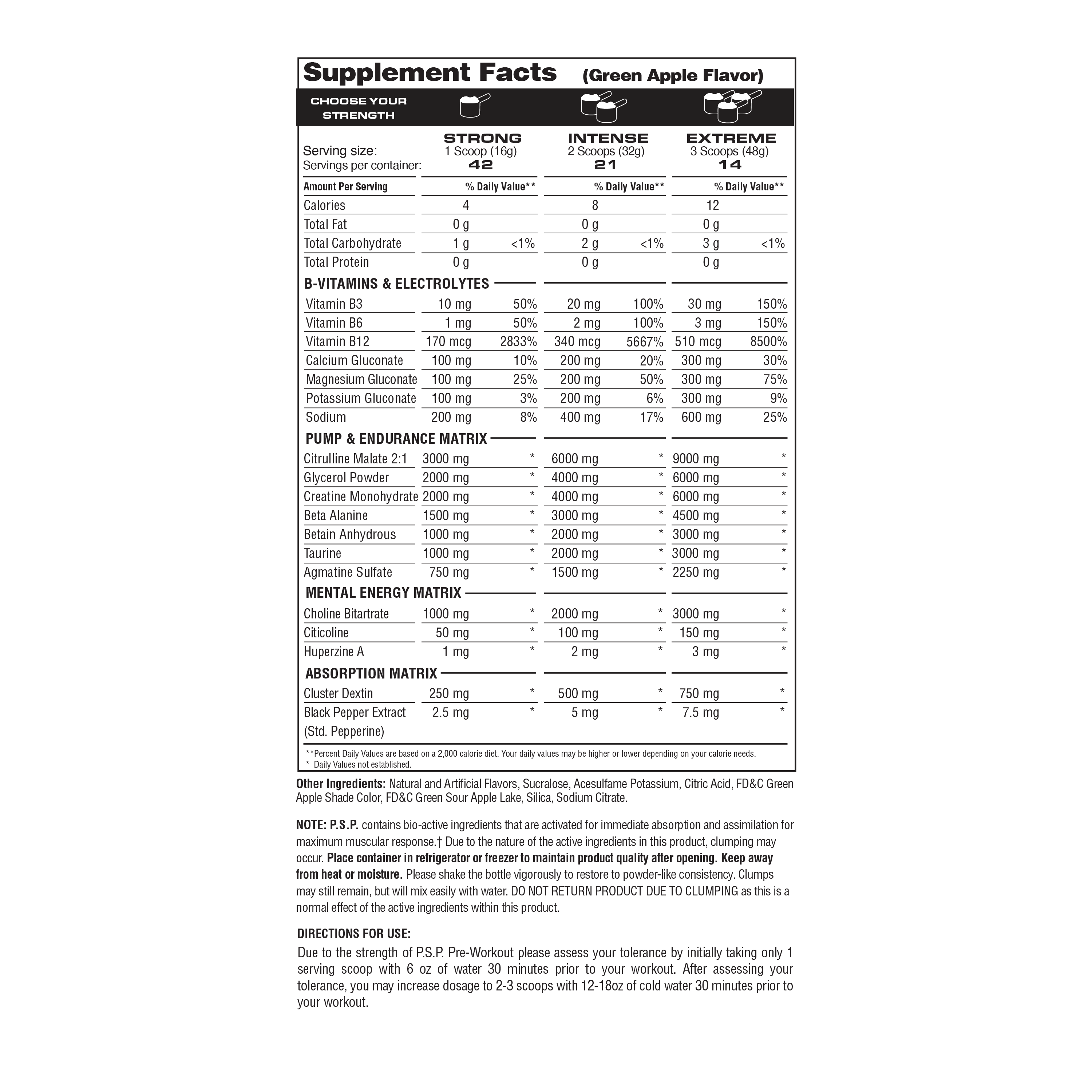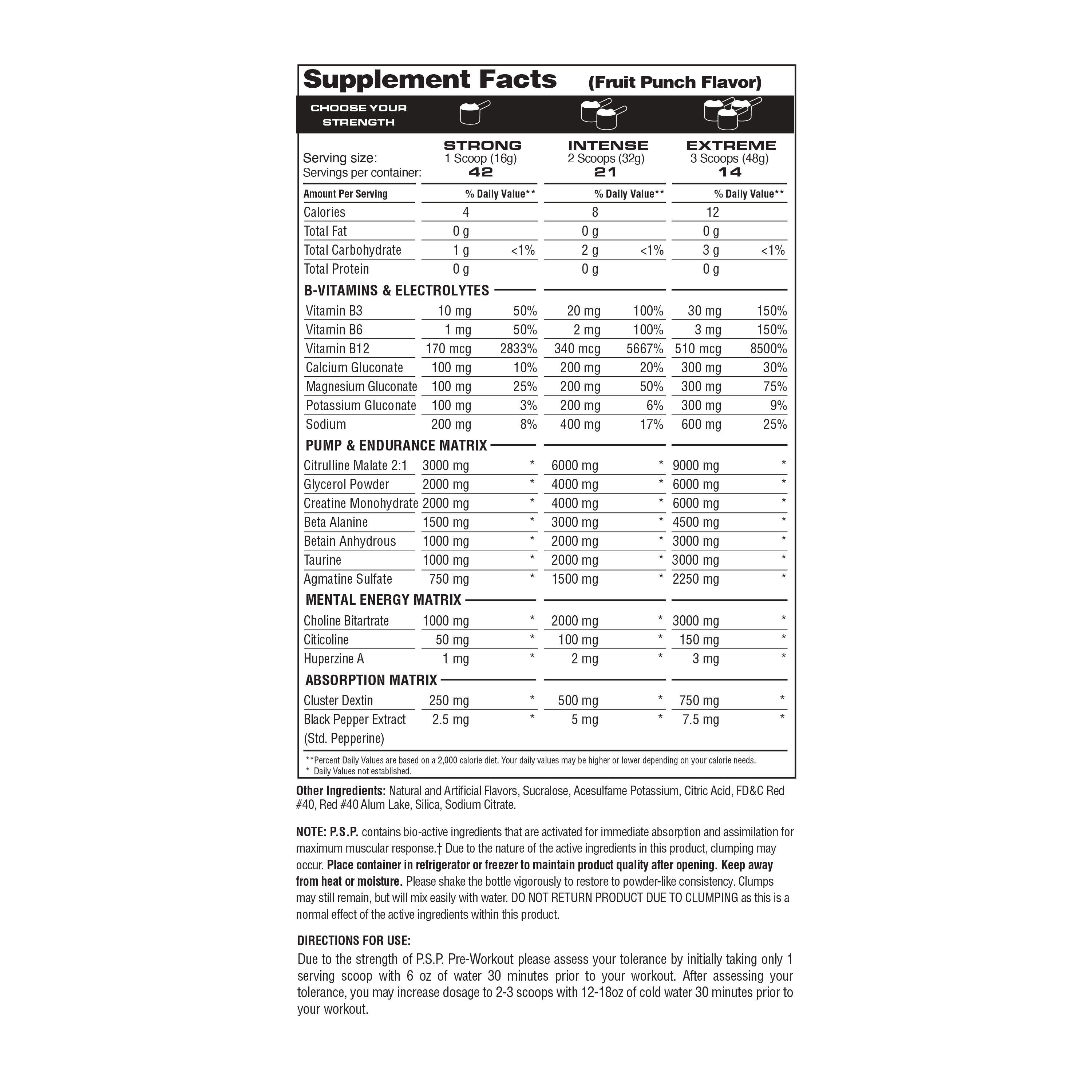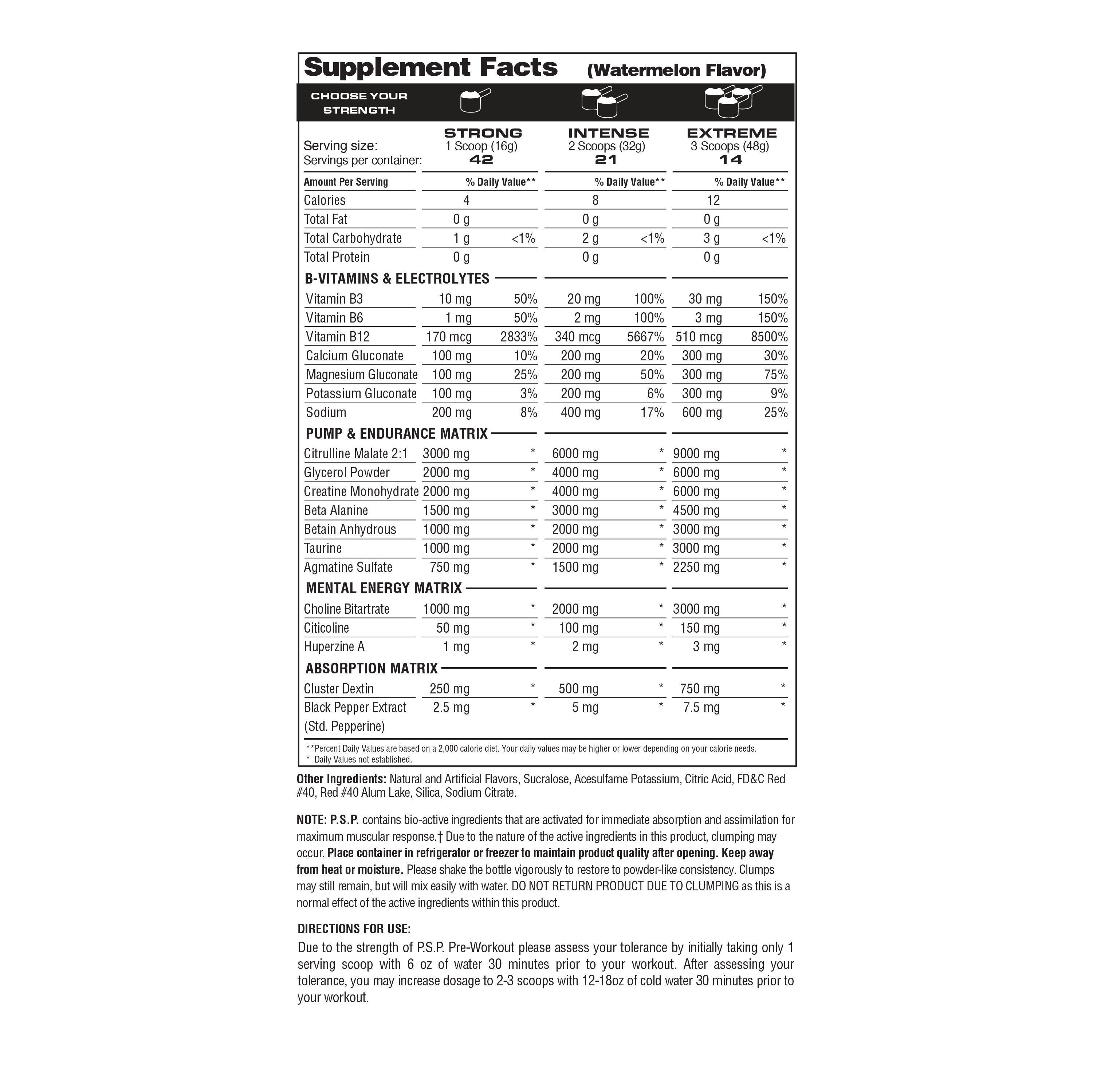 Due to the strength of P.S.P. Pre-Workout please assess your tolerance by initially taking only 1 level serving scoop with 4 – 5 oz of water 10 – 15 minutes prior to your workout. Assess your tolerance before increasing dosage. Do not exceed 3 scoops in a 24 hour period.