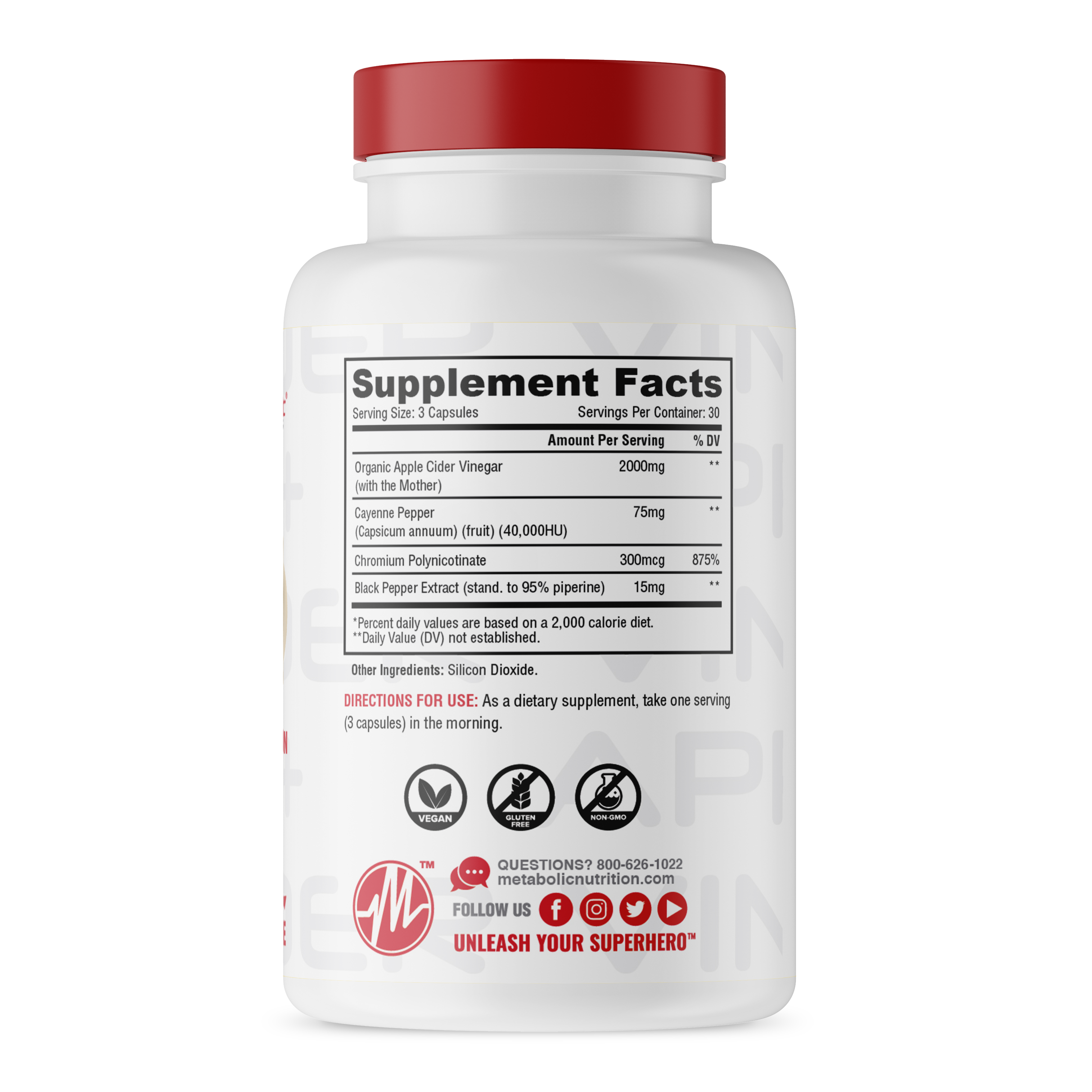 Used for centuries as a medicinal aid, Apple Cider Vinegar's main active compound is Acetic Acid, but it also contains protein strands, enzymes and friendly bacteria (know as "the Mother") which work synergistically to improve health such as improving digestion, blood sugar regulation, anti-bacterial properties, weight loss support, metabolic maintenance, and is a natural detoxifier. Metabolic Nutrition provides a purified, all natural, highly concentrated, Apple Cider Vinegar formula combined with Cayenne Pepper, Chromium Polynicotinate and Black Pepper Extract for maximum effectiveness & absorption...specifically developed for individuals who want to maximize their health and wellness.