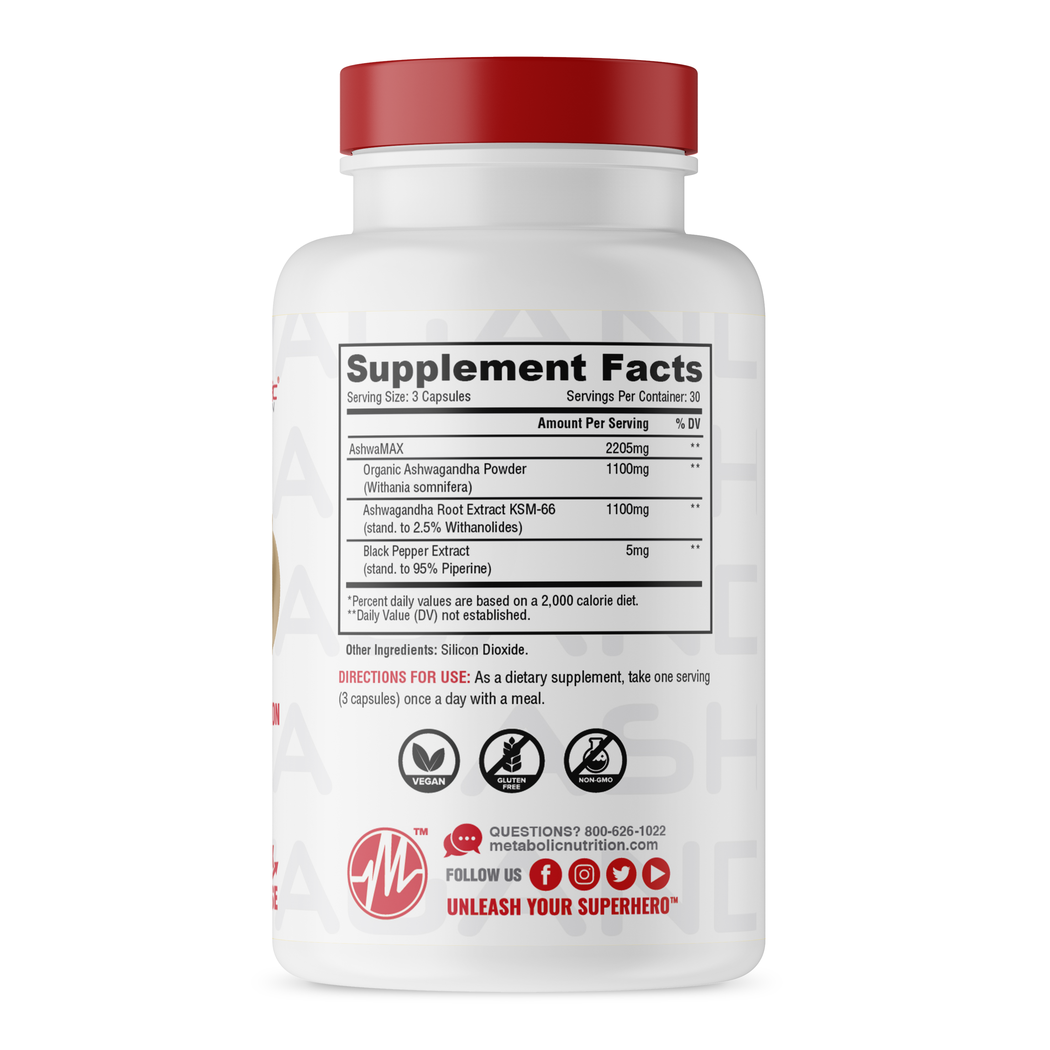 Ashwagandha is a prized herb of India that has been used for over 3,000 years as a medicinal aid for its ability to heal the body and mind. Containing many active compounds including the powerful withanolides, Ashwagandha helps provide anti-stress benefits, ability to boost energy/mood/sexual health, improved memory & cognition, reduce cortisol level, aids lean muscle mass & supports a healthy metabolism. Metabolic Nutrition provides a purified, all natural, highly concentrated, Ashwagandha formula combined with Black Pepper Extract for maximum effectiveness & absorption...specifically developed for individuals who want to maximize their health and wellness.