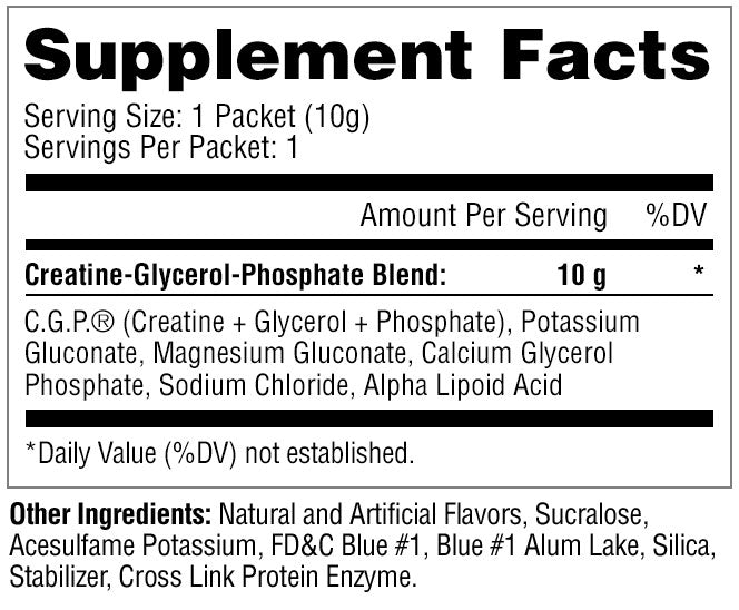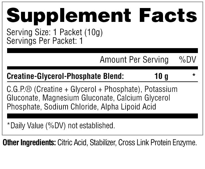 The unique phosphate-bonded creatine in C.G.P. has an unparalleled advantage in its delivery by using an additional glycerol bond to facilitate rapid absorption. C.G.P. delivers a high energy boost to your ATP supply to help delay fatigue and maximize strength development.*